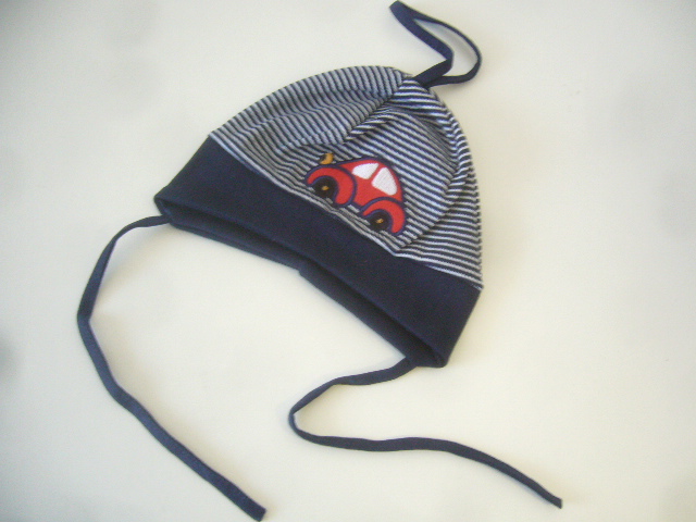 Chlapecká bavlněná čepička Anwer. Krásná čepička na zavazování s nášivkou autíčka. Složení 95%bavlna, 5% elastan