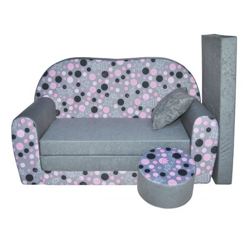 Rozkládaci dětská pohovka s bobkem a pošltářkem zdarma Jedinečná i praktická dětská pohovka pro děti. Může rovněž sloužit i na spaní, odpočívání, hraní, kreslení nebo jen ke koukání na televizi. Rozkladací pohovka je lehká dítě si ji může snadno samo přemístit kdekoliv, rozložit i složit. Pohovka je z velmi kvalitních materiálů. Díky čvrtému dopínacímu sedáků je můžete vyvýšit sezení anebo ho dokonce prodloužit. Lze ji připnout na suchý zip. Opěradlo pohovky je pevné. Rozkládací pohovka je stabilní, a dítě se může bez obav opřit.