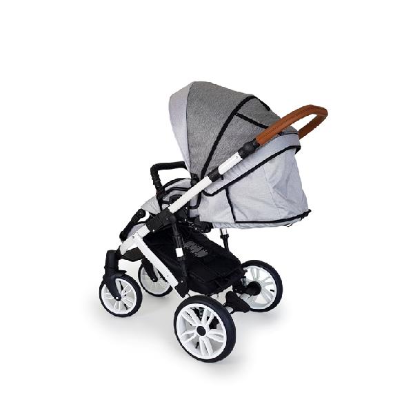 Konstrukce: Odlehčená aluminiová konstrukce. Připevnění nástaveb jediným kliknutím. Připevnění nástaveb po i proti směru jízdy. Rozložení konstrukce jediným tahem. Výškově nastavitelná kožená rukojeť s maximální výškou od země 115 cm ( 111 cm ) dle použitých koleček. Výška spodní hrany uchycené nástavby od země 60 cm. Všechna kolečka nafukovací a s ložisky. Zadní kolečka odpružená s možností blokace pružení. Přední kolečka otočná o 360° s možností aretace do pevné polohy. Velmi prostorný uzavřený nákupní košík pod kočárkem. Možnost uchycení držáku na lahvičku. Regulace pérování zadních koleček + přepínač regulace, integrované regulovatelné pružiny po stranách konstrukce pro výborné pružení kočárku.
